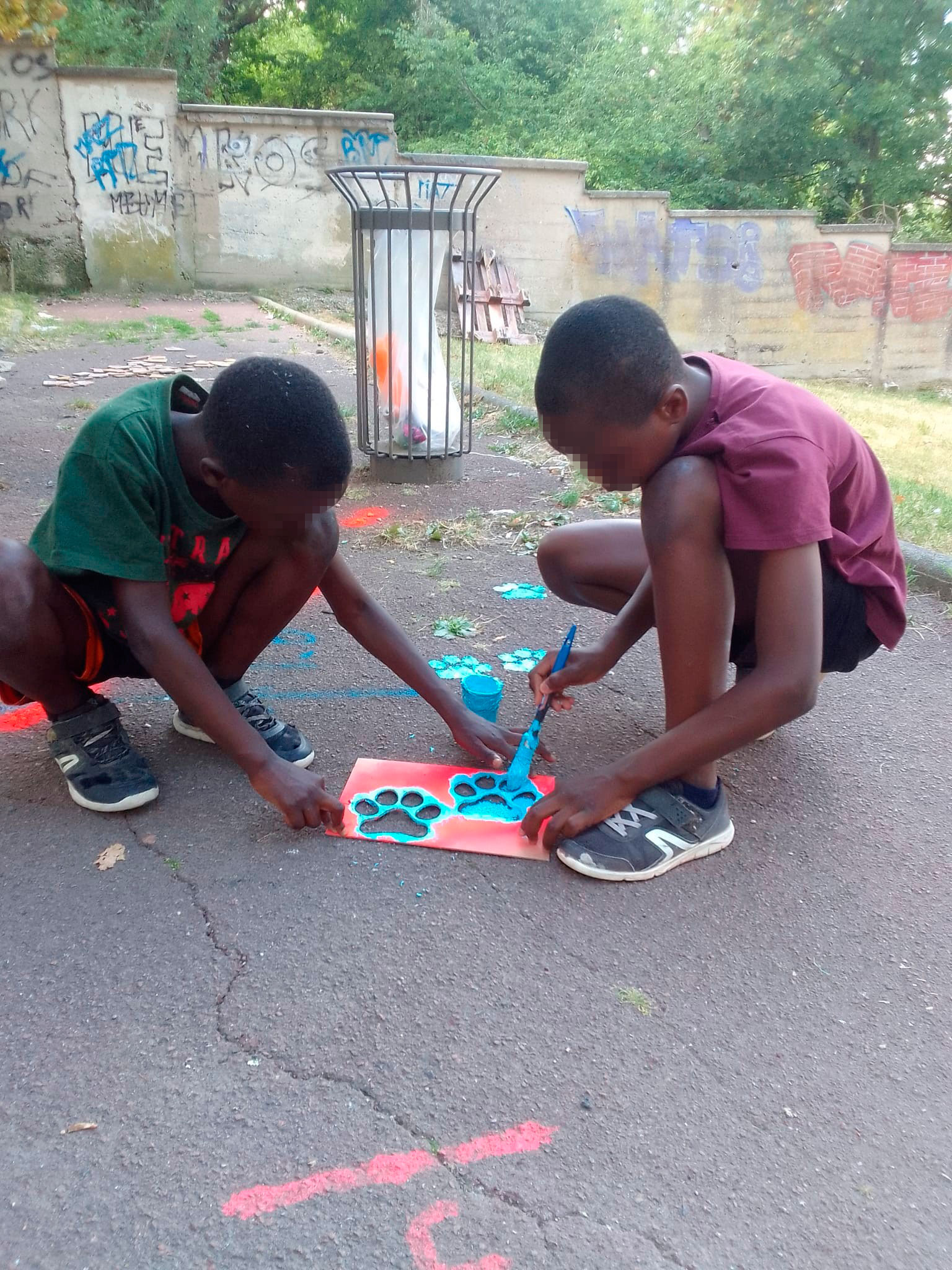 Création de pochoirs au Fablab du Petit Lien, à Clichy-sous-Bois, puis mise en peinture autour de la Maison du Projet pour encourager à mettre ses déchets dans les poubelles !